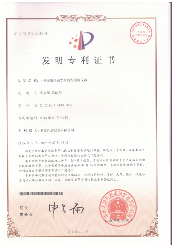 浙江托普云农科技股份有限公司(股票代码:833692)申请的“一种家用果蔬农药残留检测仪器”发明专利申请,已于2016年7月6日获得中华人民共和国国家产权局颁发的发明专利证书。