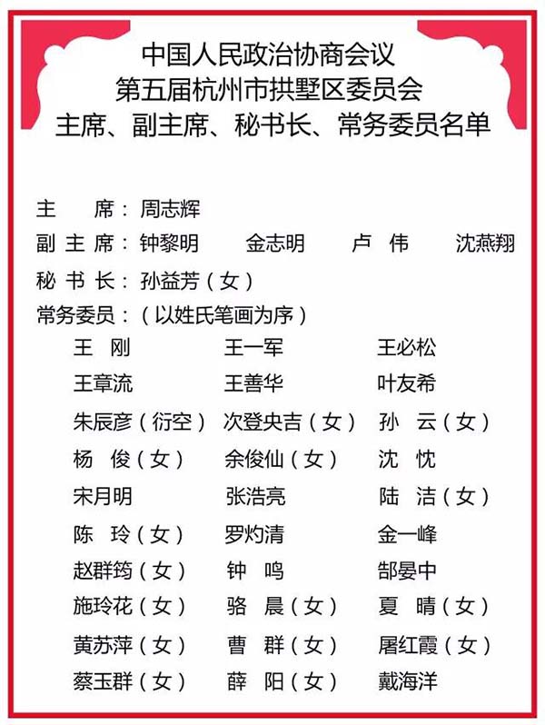 (2017年1月9日政协第四届杭州市拱墅区委员会常务委员会第29次会议通过)(以姓氏笔画为序)