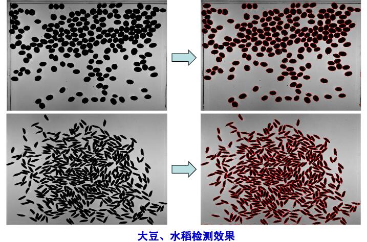 玉米自动考种系统的组成总的来说是由软件和硬件两部分组成的,但是细分的话,可以认为玉米自动考种系统是由高精度称重传感器、高分辨率摄像头、高亮度背板光源组成的,玉米自动考种系统非常适用于测量种子的数量、重量、千粒重等参数,被广泛应用于水稻、种子、小麦、玉米、大豆和油菜等种子的考种作业当中,而从实际的应用效果中,也可以看出,玉米自动考种系统能够清晰的拍摄种子图像,并进行自动化的智能识别,测定效率和准确率都,以下是玉米自动考种系统分别用于大豆、水稻和小麦的检测效果。