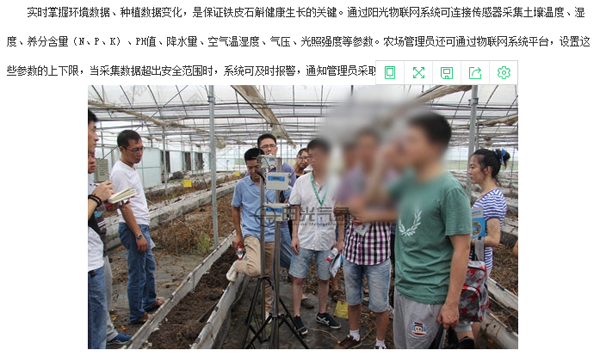 在《阳光物联网引领仙草(铁皮石斛)种植新方式》一文中,不仅“学习”物联网系统的建设原理,以及操作方式外,还引用当时参观时拍摄的图片。为了降低图片的辨识度,还对图片进行模糊处理。