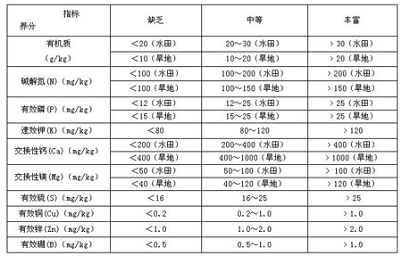 土壤养分丰缺指标是指通过土壤养分测定仪测得的土壤养分测定值与农作物产量之间的一种相关性形式。土壤养分丰缺指标可通过土壤缺少某种养分时的产量与养分齐全时得到的产量的比值来计算。根据我国国家建议标准,相对含量在50%的土壤养分含量为极低;50%-70%为缺乏,70%-90%为中等,>90%为丰富。以上的土壤养分丰缺指标是通过某种养分的相对含量高低来表示的,当相对含量>90%时,说明施肥并不需要,土壤本身的养分就足够提供农作物的成长需要。