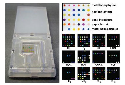科学家们在玻璃,纸片或塑料片上使用色素打印出6x6的色素阵列,然后再用特制的平板扫描仪或数码相机对这些阵列进行拍照,并将阵列的初始图像与放入有毒环境后的图像进行对比,便可测出该环境是否具有化学毒性。而且这种色素不会受到环境湿度的影响。这项开发工程是由国家健康部赞助的。