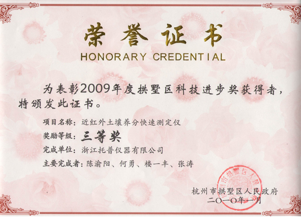 下图是近红外土壤养分快速测定仪被评为拱墅区科学技术进步奖三等奖。
