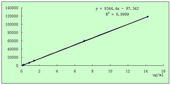 配置浓度分别为0.142、0.284、0.853、1.422、7.110、14.220μg/mL的三聚氰胺标准工作液。将以上6种标准工作液在上述色谱条件下按浓度由低至高进样。用最小二乘法以对照品浓度(横坐标X轴,µg/ ml)对峰面积(纵坐标Y轴)进行线性回归,求算标准曲线。