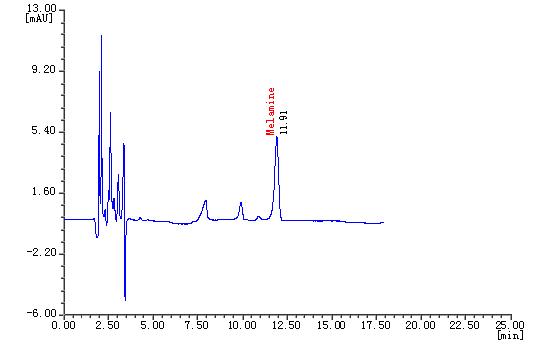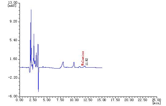 三聚氰胺(Melamine)是一种重要的三嗪类含氮杂环有机化工原料,主要用于生产三聚氰胺-甲醛树脂,广泛用于木材加工、塑料、涂料、造纸、纺织、皮革等行业,为白色晶体。三鹿奶粉事件引发了对三聚氰胺检测的广泛关注,国家质量监督检验检疫总局和国家标准化管理委员会相继发布了《原料乳与乳制品中三聚氰胺检测方法》(GB/T22388-2008)和《原料乳中三聚氰胺快速检测 液相色谱法》(GB/T22400-2008)的国家标准。本文参考了以上标准并进行配制条件优化,建立了液相色谱检测法,前处理简单,检测限、精密度、重现性以及回收率均符合国家标准。