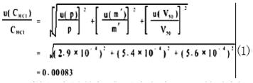 1.1 盐酸标准溶液的相对标准不确定度u(CHCL)/CHCL 的分析盐酸标准溶液的不确定度来自三方面:第一,标定盐酸用基准无机碳酸钠纯度为100%± 0.05%,按均匀分布转换成标准偏差为0.0005/ √ 3=0.00029,u(p)/p=2.9 × 10-4。第二,基准称量的变动性,在50g 以内称量的变动性通过10 次重复测定统计,标准偏差为0.05mg,天平校正产生的不确定度,按检验证书给定的± 0.1mg,在置信概率95%(k=1.96)时,换算成标准偏差为0.1/1.96=0.051,即u ( m’) / m ’= 5 . 4 × 1 0 -4。第三,5 0 m L 滴定管的不确定度按检验证书给定的± 0.04mL,按均匀分布换算标准偏差为0.04/ √ 3=0.023mL,充满液体至滴定管刻度的变动性通过重复6次测定统计,标准偏差为0.012mL,滴定管与溶液温度校正时温度不同引起的体积不确定度,假设差为2℃,对水体积膨胀系数为2.1 × 10-4/℃,则95% 置信概率(k=1.96)时体积变化的区间为± 50 × 2 × 2.1 × 10-4= ± 0.021 mL,转换成标偏差为0.021/1.96=0.011。u(V50)/V50=5.6 × 10-4。根据以上三项得出的盐酸标准溶液的相对标准不确定度为: