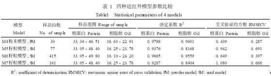 ²ÉÓÃ4¸ö½¨Ä£ÑùÆ·¼¯,ÓÉȨÍþ¼ì²âÖÐÐÄ(ÒÔM2±íʾ)ÒÀÕÕGB290521982ºÍGB290621982»ñµÃ»¯Ñ§Öµ¡£½üºìÍâ¼ì²â²ÉÓõ¹úBruker¹«Ë¾µÄMatrix2I¸µÁ¢Ò¶½üºìÍâ¹âÆ×·ÖÎöÒÇ,È¡ÊÊÁ¿´ó¶¹×ÑÁ£ÖÃÓÚÑùÆ·±ÖÐ,ÓÃ͸É䷽ʽɨÃè»ñµÃ´ó¶¹×ÑÁ£ÑùÆ·µÄ½üºìÍâÎüÊÕ¹âÆ×ͼ,ɨÃèÆ×Çø4 000¡«12 600 cm- 1 ,·Ö±æÂÊ16 cm- 1 ,ɨÃèËÙ¶È10 KHz,ɨÃè´ÎÊý60´Î,ÿ¸öÑùÆ·ÖØ¸´×°ÑùɨÃè3 ´Î¡£ÀûÓÃB ruker ¹«Ë¾µÄOPUS412Èí¼þµÄQuant 2 ·½·¨, ÒÔÆ«×îС¶þ³Ë·¨( PLS)½¨Á¢´ó¶¹·ÛÄ©¡¢×ÑÁ£½üºìÍâ¼ì²â´Öµ°°×¼°´ÖÖ¬·¾º¬Á¿µÄÄ£ÐÍ,ʹÓý»²æ¼ìÑé·¨¶ÔÄ£ÐÍ×ö³öÆÀ¼Û¡£