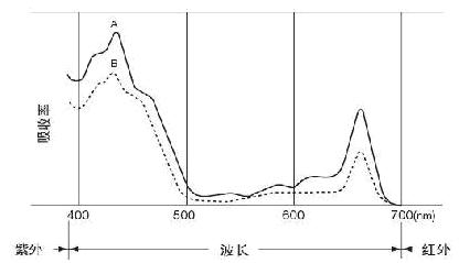 从图中可以看出,叶绿素在蓝色区域(400—500nm)和红色区域(600—700nm)范围内吸收达到了峰值,但在近红外区域却没有吸收。也就是说,不同波长的光线,叶绿素的吸收量是不同的。这也正好符合了我们的要求,通过不同的吸收量,来测出spad值。