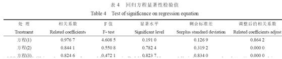 ¶Ô²»Í¬ÊÕ»ñÆÚÖ²Öê´ÖÖ¬·¾²úÁ¿½á¹û½øÐжþ´Î»Ø¹éÄâºÏ(±í6¡¢±í7)½á¹û±íÃ÷, »Ø¹é·½³Ì¼ìÑéÖµÓë»Ø¹éϵÊý¼ìÑéֵδÍêÈ«´ïµ½ÏÔÖøË®Æ½, ±íÃ÷Ó°Ïì´ÖÖ¬·¾²úÁ¿µÄ3 Òò×ÓÖÐ, ¸ö±ðÒò×ÓÓë´ÖÖ¬·¾²úÁ¿Ïà¹Ø²»ÏÔÖø¡£8 ÔÂ11 ÈÕÊÕ»ñ, N¡¢Ãܶȵ¥Òò×ÓÓë´ÖÖ¬·¾²úÁ¿Ïà¹Ø²»ÏÔÖø; P ÃܶȻ¥×÷Óë´ÖÖ¬·¾²úÁ¿Ïà¹Ø²»ÏÔÖø¡£8 ÔÂ26 ÈÕÊÕ»ñ, P Óë´ÖÖ¬·¾²úÁ¿Ïà¹Ø²»ÏÔÖø; N ÃܶȻ¥×÷¡¢P ÃܶȻ¥×÷Óë´ÖÖ¬·¾²úÁ¿Ïà¹Ø²»ÏÔÖø¡£9 ÔÂ12ÈÕÊÕ»ñ, N¡¢P µ¥Òò×ÓÓë´ÖÖ¬·¾²úÁ¿Ïà¹Ø²»ÏÔÖø; P ÃܶȻ¥×÷Óë´ÖÖ¬·¾²úÁ¿Ïà¹Ø²»ÏÔÖø¡£