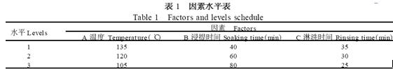 1. 4 ¡¡Õý½»Éè¼ÆÌáÈ¡·½·¨¡¡¡¡¸ù¾ÝÈȽþÌᡪÓÍÖØ·¨²â¶¨ÔÀí,Ñ¡¶¨½þÌáζÈ(A) ¡¢½þÌáʱ¼ä(B) ºÍÁÜϴʱ¼ä(C) ×÷Ϊ¿¼²ìÒòËØ,¸÷Éè3 ¸öˮƽ,Ñ¡ÓÃL9 (34 ) Õý½»±í½øÐÐÊÔÑé(¼û±í1) ,Èý´ÎÖØ¸´¡£