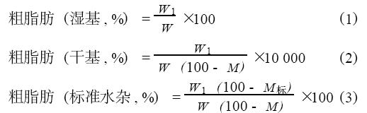 粗脂肪湿基含量、干基含量和标准水杂含量分别按公式(1) 、(2) 和(3) 计算: