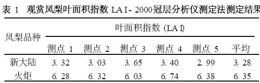 2. 1¡¡LA I - 2000¹Ú²ã·ÖÎöÒDzⶨ·¨µÄ²â¶¨½á¹û²ÉÓÃLA I - 2000¹Ú²ã·ÖÎöÒDzⶨËùµÃ¹ÛÉÍ·ïÀæÆ·ÖÖ¡°Ð´ó½¡±ºÍ¡°»ð¾æ¡±µÄÒ¶Ãæ»ýÖ¸Êý½á¹û¼û±í1¡£