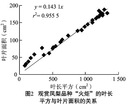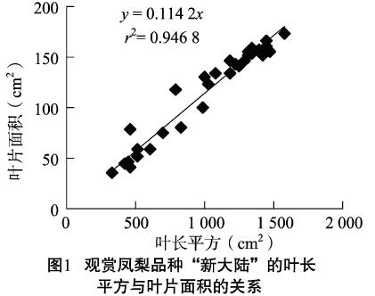 2. 3. 1¡¡»Ø¹é·½³ÌµÄ»ñµÃ¡¡ÓÉͼ1ºÍͼ2¿ÉÖª,¡°Ð´ó½¡±ºÍ¡°»ð¾æ¡±2¸ö¹ÛÉÍ·ïÀæÆ·ÖÖÒ¶³¤µÄƽ·½ÓëÒ¶Æ¬Ãæ»ý¶¼´æÔÚ×ÅÏÔÖøµÄÏßÐÔÏà¹Ø¹ØÏµ¡£¡°Ð´ó½¡±Æ·ÖÖ,ÓÉÒ¶³¤¼ÆËãÒ¶Æ¬Ãæ»ýµÄ¹«Ê½Îª:Ò¶Ãæ»ý(LA)= 0. 114 2 ¡ÁÒ¶³¤Æ½·½(L2 ) , r2 = 0. 946 8;¡°»ð¾æ¡±Æ·ÖÖ,ÓÉÒ¶³¤¼ÆËãÒ¶Æ¬Ãæ»ýµÄ¹«Ê½Îª:Ò¶Ãæ»ý(LA) =0. 143 1 ¡ÁÒ¶³¤Æ½·½(L2 ) , r2 = 0. 955 5¡£
