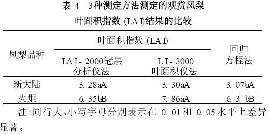 ´Ó±í4¿ÉÒÔ¿´³ö,¡°Ð´ó½¡±Æ·ÖÖ, 3ÖÖ·½·¨²â¶¨µÄ½á¹ûÔÚ0. 01ˮƽÉÏûÓÐÏÔÖø²îÒì;¶ø¡°»ð¾æ¡±Æ·ÖÖ,L I - 3000Ò¶Ãæ»ýÒÇ·¨ÓëÁíÍâ2ÖÖ·½·¨µÄ²â¶¨½á¹ûÔÚ0. 05ºÍ0. 01ˮƽ¶¼´æÔÚÏÔÖø²îÒì¡£×ÜÌåÉÏ,L I - 3000Ò¶Ãæ»ýÒÇ·¨µÄ²â¶¨½á¹û¾ù¸ßÓÚLA I - 2000¹Ú²ã·ÖÎöÒÇ·¨ºÍ»Ø¹é·½³Ì·¨¡£