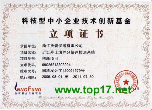 热烈祝贺浙江托普仪器有限公司自主研发的近红外土壤养分速测系统获得科技型中小企业技术创新基金!
