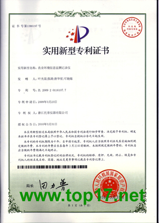 多年来,浙江托普仪器有限公司在产品研发上一直孜孜以求,投入很大的人力与财力,以继续保持并发扬浙江托普的品牌。此次浙江托普农业环境记录仪获实用新型专利和软件著作权就是一个很好的证明,我们会继续努力,不辜负广大朋友对我们的信赖与支持!