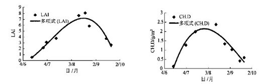 在水稻的光合作用过程中影响水稻有机物质合成的主要因素有叶面积(LAI)、叶绿素含量(CH.D)、阳光、二氧化碳的浓度等,在光合反应过程中叶面积过大也不一定会利于植物的有机物质的合成,而水稻的叶面积以及叶绿素含量增加有一定的规律的,通过使用便携式叶面积测定仪对水稻的叶面积来进行测量,接着通过使用叶绿素计来对叶绿素含量进行测量,得出如下图显示:
