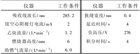 膏状的叶绿素中主要是叶绿素镁钠盐,在进行试验的时候,称取0.100 5 g叶绿素镁钠盐,配制成50.00 mL叶绿素的储备液。准确移取1.00 mL叶绿素镁钠溶液于8只50.00 mL容量瓶中,再分别加入0.00、2.00、2.20、2.40、2.60、2.80、3.00、3.20 mL的50.00 mg·L-1Mg2+标准溶液,定容,摇匀。按一下的测定环境要求使用原子吸收分光光度计测定并绘制工作曲线,并计算线性回归方程。就可以通过这一线性方程来进行计算叶绿素含量了。