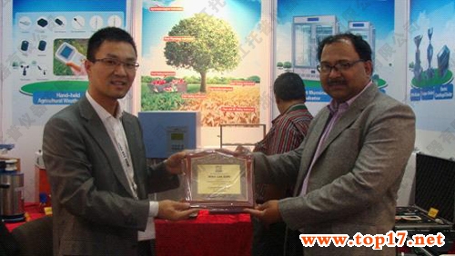 图为:印度领导为托普仪器陈渝阳总经理颁发奖项