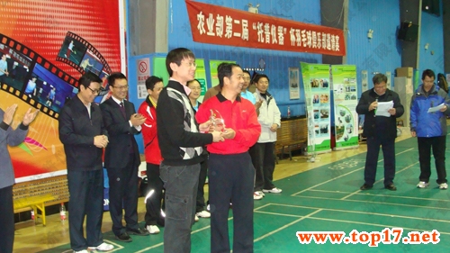 全国农技中心陈生斗主任为本次活动开幕式致辞中表示:这次很高兴能参加本次“托普仪器”杯羽毛球邀请赛,首先感谢浙江托普仪器有限公司为本次活动的全力赞助。就如本次活动主题以“开展文体活动,推进文化建设”一样,不仅丰富大家的业余生活,通过体育活动倡导强身健体、积极向上的氛围,还增进了农业部系统内各羽毛球俱乐部之间的沟通和交流。赛后,农业部机关党委张广卿处长、农业部市场司张合成司长和浙江托普仪器有限公司陈渝阳总经理颁发优胜奖奖杯,全国农技中心陈生斗主任颁发季军奖杯,部直属机关党委唐珂常务副书记颁发亚军奖杯,部党组成员、人事劳动司梁田庚司长颁发冠军奖杯。
