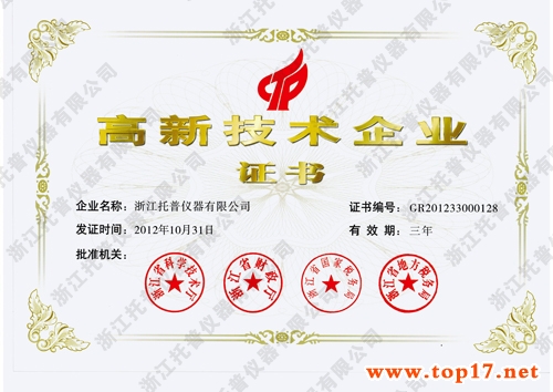 恭喜浙江托普仪器有限公司被国家科技部、财政部、国家税务总局等单位认定为“国家高新技术企业”!根据《高新技术企业认定管理办法》规定,国家高新技术企业是指在《国家重点支持的高新技术领域》内,持续进行研究开发与技术成果转化,形成企业核心自主知识产权,并以此为基础开展经营活动,在中国境内(不包括港、澳、台地区)注册一年以上的居民企业。