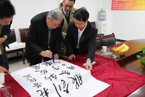 图为:中国科学院院士、原浙江农业大学校长、中国核农学创始人陈子元院士(右二),全国农业技术推广中心栗铁申副主任(中间),全国农业技术推广中心节水处高祥照处长(右一),杭州市拱墅区区委常委、区科技工业功能区管委会范永晨书记(左二)在签名处合影留念