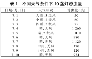 ÔÚÀ¥³æÓð»¯Ê¢ÆÚ7ÔÂÑ¡Ôñ1~10ÈÕµÄͳ¼Æ½á¹û±íÃ÷(±í1),ÎÞ·ç¡¢ÇçÌìÓÕ³æÊýÁ¿Ã÷ÏÔ¸ßÓÚÒõÓê¶à·çµÄÌìÆø,ÌØ±ðÊÇÓêÌìÓÕ³æÁ¿ºÜÉÙ,Òò¶øÓêÌì²»ÒË¿ªµÆ¡£