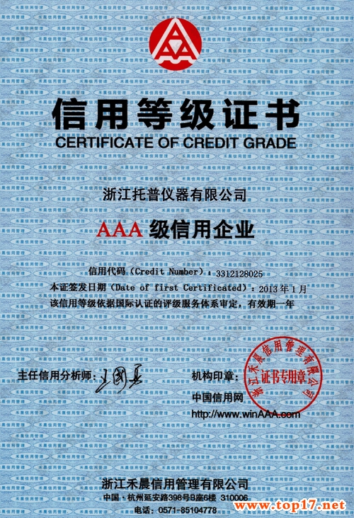 热烈祝贺浙江托普仪器有限公司在2013年1月获得AAA级信用企业称号。