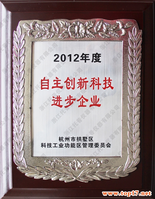根据杭州市拱墅区科技工业功能区管委会研究决定,为了进一步引导企业自主创新,走新型工业化道路,加快发展高薪技术产业,不断优化产品结构,特授予托普仪器“自主创新科技进步企业”荣誉称号。
