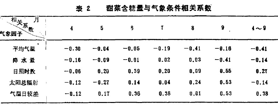气候含糖量与4~9月气温日较差呈正相关(见表2),相关系数r=38,5,月各月均为正相关,7月达。8~9月达53,具有与日照相关相同的趋势,因此气温百较差也是影响甜菜搪分积累的主要气象因子之。