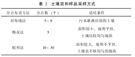 在土壤环境质量监测工作中,一般采集混和土样,即在一个采样区,把多点采集的土样混合成一个样品,一方面可以减少分析量,另一方面可以把采样区微量不均匀性的影响减到最低限度。采样时应沿着一定的路线,按照/随机0、/等量0和/多点混合0的原则进行。在该次土壤调查中常用的多个采样点的布设方法是:对角线采样法、蛇形采样法和梅花形采样法等,其适用条件和采样的分点数见表2。