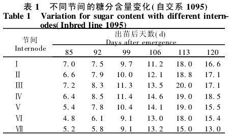 2.2 不同节间糖分含量的变化 就高糖系1095而言,一共7个节间,6个测定时期中的4个时期糖分含量最高值出现在第?节间,2个时期是第?节间的含糖量最高(表1)。就低糖系N3来说,情况与高糖系1095相比,略有不同。亲本N3共有6个节间,6个测定时期中的4个时期是第?节间含糖量最高,g个时期(106 d)是第?节间含糖量最高,另一个时期(99 d)是第?节间含糖量最高。据此,作者认为高粱茎秆中糖分含量最高的节间应该是中部节间或上一节间,这将给准确测定高粱茎秆中糖分含量提供理论依据。
