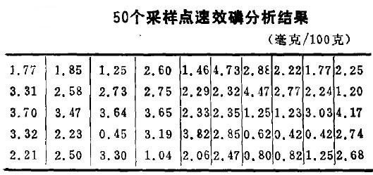 在调查的耕地上,以等距离方格法,单点采集土壤样品50个,单独以相兰法分析其速效磷,五十点样品速效磷分析结果如表2,表2中次序是采样点的实际位置。50点速效磷分析结果的均值仅2.349毫克/百克土,极差(R)4.51,方差(52)1.1,不均匀率(CV)0.348。