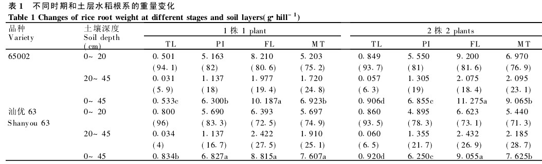 根系重量以开花期为最大,从分蘖期到开花期根系重量为增长阶段,开花后为下降阶段.1998年根系生长动态与1999年趋势相同,现以1999年资料为例说明.开花期总根量除汕优63单本种植外其它处理均显著高于其它时期,分蘖期根量显著低于其它时期(表1).65002从分蘖期到穗分化期和穗分化期到开花期根系重量平均增长519和411g,开花期到成熟期根量平均下降218g.汕优63从分蘖期到穗分化期和穗分化期到开花期根系重量平均增长517和214g,开花期到成熟期根量平均下降114g(表1).由此可见,水稻根系重量的主要增长期在分蘖期到穗分化期.花后根系重量下降主要发生在0~20cm耕层中,65002和汕优63分别下降2162g和0194g,而土层20~45cm的深层根系重量下降相对较小(表1).每筒种植2株比1株各生育期根量均增加.
