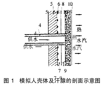 ¡¡¡¡Í¼ÖÐ(4)Ϊ´©¹ýÓ²ÖÊÅÝÄËÜÁϲãС¿×±¡µÄϸСµ¼¹Ü,(5)Ó²ÖÊÅÝÄËÜÁϳÉÐÍÄ£ÄâÈË¿ÇÌå,(6)¿ÇÌåÍâ±íÃæÓõçÈÈË¿²øÈÆ,(7)¹Ì¶¨µçÈÈË¿µÄ¾øÔµ±¡Ä¤, (8)´ÓµçÈÈ˿ɢÈȵĽðÊô²ã, (9)¹Ì¶¨Î¶ȴ«¸ÐÆ÷Ïß·µÄËÜÁϲã,(10)ÓÃÀ´¸²¸ÇÄ£ÄâÈ˵ÄѹºÏ²ÄÁÏ,ÆäÄÚÒ»±ß½«Ë®´Ó¹Ü×ÓÀ©É¢µ½¸ü´óµÄÃæ»ý,ÍâÃæÊÇ΢¿×¾ÛËÄ·úÒÒϩĤ,´ËĤ½öÀ©É¢Ë®Æû¶ø²»À©É¢ÒºÌåË®¡£Ä£ÄâÈË¿ÇÌå±íÃæ²ÄÁÏÊÇÒ»ÖÖ±¡ÐÍÍø×´±£»¤ÌåÒÔ·ÀÖ¹»úеËðÉ˵ÄΣÏÕ¡£ÓÃÀ´²âÁ¿²¢¿ØÖƱíÃæÎ¶ȵĽðÊô˿ζȴ«¸ÐÆ÷ÊÇÔÚѹºÏ²ÄÁϵÄÏÂÃæ,²¢Áª½Ó×Ô¶¯³ÌÐò¿ØÖƹñ,һ̨΢ÐͼÆËã»úÓÃÀ´¿ªÊ¼ÊÔÑé½øÐнá¹ûµÄ´òÓ¡¡£