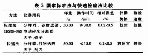 由表1,2可知,碎米含量检验,快速法与标准法比较,结果误差,标一早米为+0.6%,标一晚米为一0.4%,均小于土2%,检验时间缩短20 min。大米碎米含量快速法具有误差小,速度快、时间短的优点,可应用于大米生产、销售中碎米含量的检验与控制。