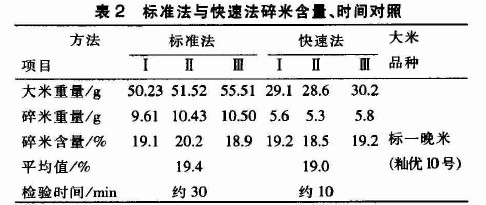 从检验过杂质的大米样品中,用分样器平均分取约25g大米,倒人合适也径的筛层内,以每秒1转的速度,回转半径约10 cm,在玻璃板上正反时针回转各筛10圈,取出筛,将筛上大米小心倒在玻璃板一端,将筛下物倒人样品盘内,重新套好筛层,再将筛下物倒人筛内,以同样的方法再筛选2次。第二次正反时针回转各筛8圈,第三次筛4圈。将筛上物和筛下物分开倒在玻璃板上。按规定拣出碎米中的整米、整米中的碎米,用感量0.1 g的天平称取碎米重量,计算碎米含量,记录每次检验时间。检验结果对照见表1、表2