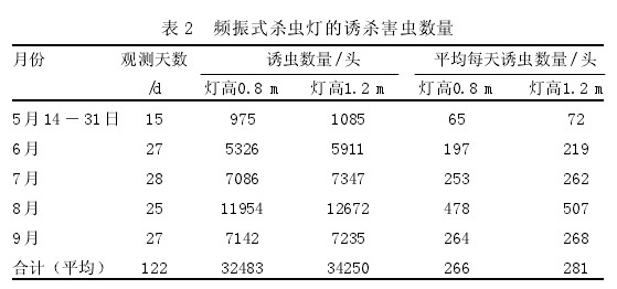 ¡¡¡¡2.ÓÕɱº¦³æÊýÁ¿´óʾ·¶Çø¹Ì¶¨2յɱ³æµÆ£¬1ÕµµÆ¸ß0.8m£¬1ÕµµÆ¸ß1.2m£¬´Ó5ÔÂ14ÈÕ£9ÔÂ30ÈÕÀúʱ139d£¬ÆäÖÐÏÂÓêÈÕ14d£¬Í£µç¹ÊÕÏ3d£¬Êµ¼Ê¼ÇÔØÌìÊý122d¡£±í2¿É¼û£¬µ¥µÆ×î¸ßÿÌì¿ÉÓÕɱº¦³æ507Í·£¬Æ½¾ù273Í·¡£