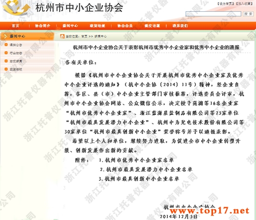 ¸ù¾Ý¡¶º¼ÖÝÊÐÖÐСÆóÒµÐ»á¹ØÓÚ¿ªÕ¹º¼ÖÝÊÐÓÅÐãÖÐСÆóÒµ¼Ò¼°ÓÅÐãÖÐСÆóÒµÆÀÑ¡µÄ֪ͨ¡·£¨º¼ÖÐСÆóС²2014¡³11ºÅ£©¾«Éñ£¬¾ÆóÒµ×Ô¼ö£¬¸÷Çø¡¢ÏØ£¨ÊУ©ÖÐСÆóÒµÖ÷¹Ü²¿ÃÅÉóºËÍÆ¼ö£¬ÆÀѡίԱ»áÆÀÉ󣬺¼ÖÝÊÐÖÐСÆóҵлáÍøÕ¾¡¢¹«ÖÚ΢ÐŹ«Ê¾£¬¾ö¶¨ÊÚÓè·¶Ô¨µÈ16ÃûÆóÒµ¼Ò¡°º¼ÖÝÊÐÓÅÐãÖÐСÆóÒµ¼Ò¡±¡¢Õã½À¶º£ÐÇÑÎÖÆÆ·ÓÐÏÞ¹«Ë¾µÈ25¼Òµ¥Î»¡°º¼ÖÝÊÐ×î¾ß·¢Õ¹Ç±Á¦ÖÐСÆóÒµ¡±¡¢º¼ÖÝÖÐΪ¹âµç¼¼Êõ¹É·ÝÓÐÏÞ¹«Ë¾µÈ30¼Òµ¥Î»¡°º¼ÖÝÊÐ×î¾ß´´ÐÂÖÐСÆóÒµ¡±ÈÙÓþ³ÆºÅ²¢ÓèÒÔͨ±¨±íÕá£