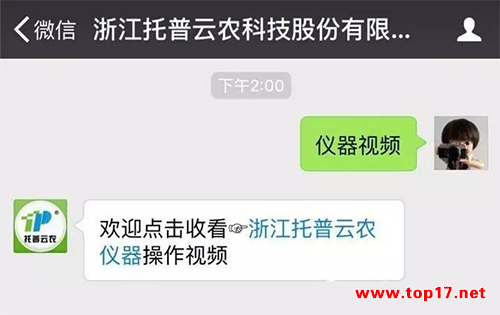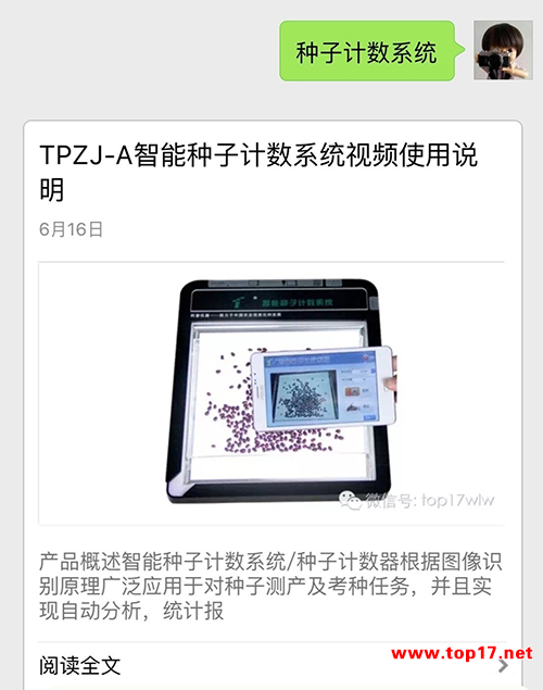 现在只需关注“浙江托普云农科技股份有限公司”的微信公众号,回复对应的关键字,即可查看仪器操作视频,比如需要查看智能种子技术系统的操作视频,只需要回复“种子计数系统”或者仪器型号即可了解如何使用仪器,查看仪器的相关参数和功能。