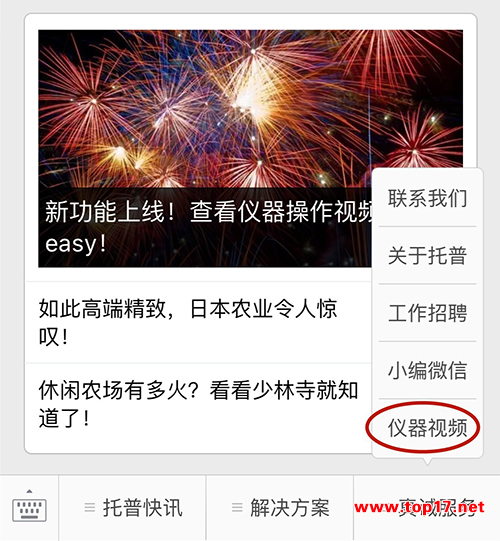 在“浙江托普云农科技股份有限公司”微信号的菜单栏也提供了查看视频的入口,只需要选择“真诚服务”→“仪器视频”即可进入页面查看。