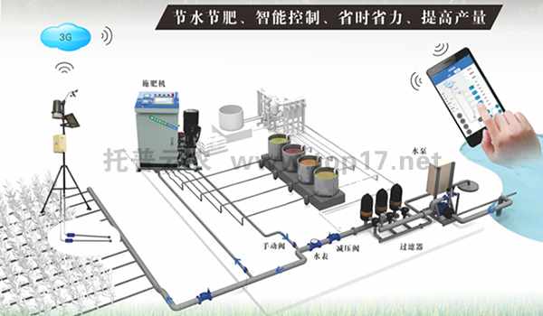 托普水肥一体化智能灌溉系统可以帮助生产者很方便的实现自动的水肥一体化管理。系统由系统云平台、墒情数据采集终端、视频监控、施肥机、过滤系统、阀门控制器、电磁阀、田间管路等组成。