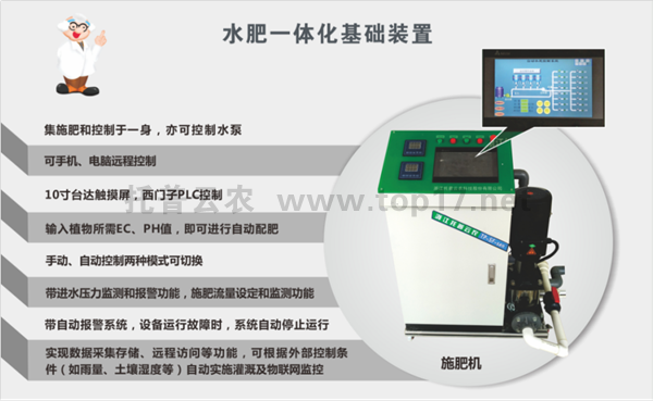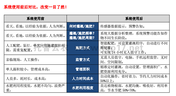 整个系统可根据监测的土壤水分、作物种类的需肥规律,设置周期性水肥计划实施轮灌。施肥机会按照用户设定的配方、灌溉过程参数自动控制灌溉量、吸肥量、肥液浓度、酸碱度等水肥过程的重要参数,实现对灌溉、施肥的定时、定量控制,充分提高水肥利用率,实现节水、节肥,改善土壤环境,提高作物品质的目的。该系统广泛应用于大田、旱田、温室、果园等种植灌溉作业。